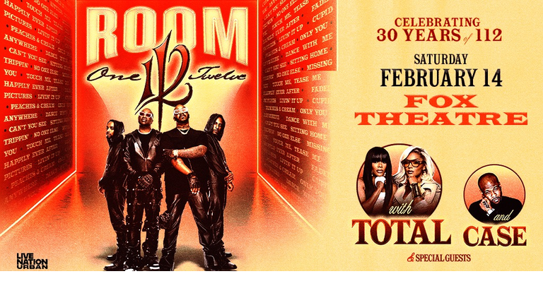 112: Room 112 Tour with Total and Case Saturday, February 14, 2026 Fox Theatre Get tickets here: https://www.ticketmaster.com/event/08006317E7574267